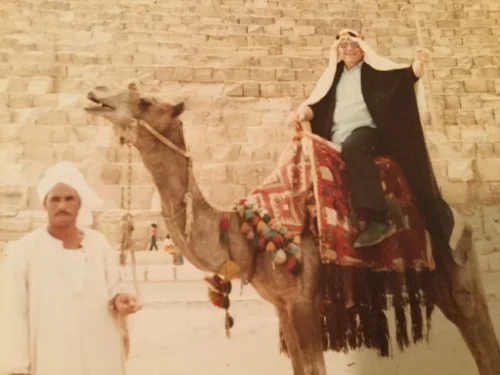 As an engineering and construction executive, my dad often travelled internationally when I was young. Cairo, Egypt, peaked my interest as especially significant in the whole old world out there. I enjoyed his stories of tunneling through the minute doorway openings within the pyramid brick in the Valley of the Kings and into the cool, dusty chambers with their craved sarcophagi. The photo (below) of him grinning, perched atop a camel and wearing wing tips, suit slacks and a Mexican wedding shirt with a shepherd’s head towel and staff depicts how great a day immersed in the history of another culture can be.
