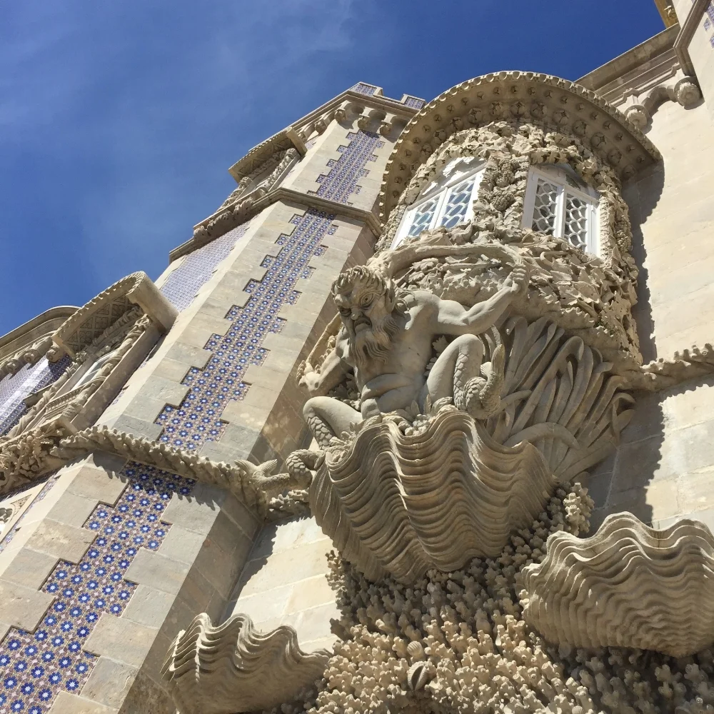 From the exterior’s architectural ornamentations to the interior artful wall treatments throughout, Pena Palace materialized the King’s vision and depth of artistic enthusiasm. A product of that seafaring Age of Discovery, Manueline architectural detailing incorporated in the stone carving and tile all things ocean bound, navigational and nautical, under the sea and ship like. On the visitor’s approach, centerstage on the Terrace of the Triton and looming above the portal to the original palace entrance was carved in stone mythical sea god, Triton, with his man and fish combo body crouched on a fabulously ridged shell floating on a delicate coral bed. Palace history conveyed assorted grand interpretations of the Triton’s crabby presence—either scientific or Manueline design in meaning—but I found the winning explanation to be that his likeness once inhabited an area beach cave.